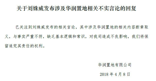 4月8日,针对万科独立董事刘姝威指责华润置地将109亿元的地块以4亿出售给宝能集团,以及和宝能共同开发地块亏损4.25亿一事,华润置地回应称,“已关注到刘姝威发布的相关言论,其中涉及华润置地的相关内容断章取义,与事实严重不符,缺乏基本逻辑和常识,对我司造成不良影响,我们将保留追究其责任的权利。”