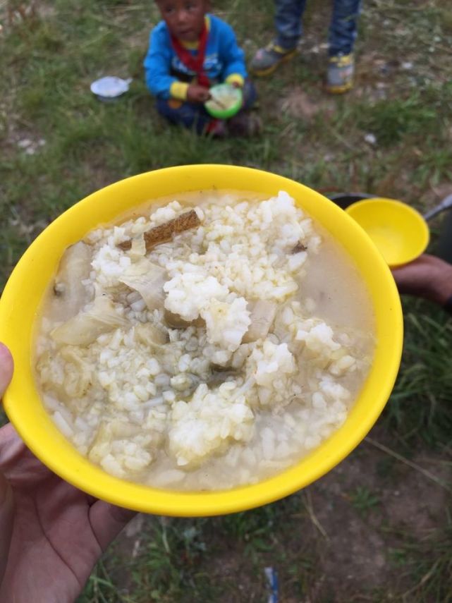 他们的一日三餐都由寺庙提供,早餐通常是面块或糍粑,午餐是饭菜或汤馒头和菜,晚餐是面条和面块,一个孩子每天的伙食只有2元。图为野菜和汤汁配上一些硬硬的米饭,也许能够吃饱他们就很满足了吧?