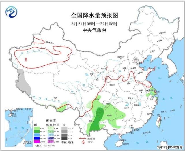 3月20日08时至21日08时,新疆北部山区、内蒙古西部及中部、陕西北部、山西西部、青海东南部、川西高原北部等地的部分地区有小雪或雨夹雪;西南地区中部及东部、黄淮中南部、江淮、江南东部、华南东部、海南等地有小到中雨,其中海南局部有大雨(25~28毫米),上述部分地区并将伴有短时强降水等强对流天气。甘肃东部、辽东半岛、华北东部、黄淮东部、江淮东部等地有4~5级风,南疆盆地局地有浮尘或扬沙天气。