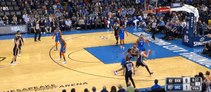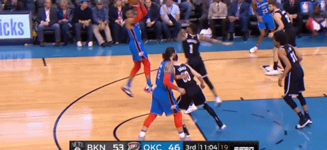 雷霆开场状态不佳,韦斯布鲁克扛起了球队的进攻,首节中段,韦少冲击篮下,面对篮下的贾勒特-艾伦,强行攻击篮筐得分。