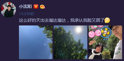 5月2号下午, 小沈阳在社交媒体晒出携妻子外出散步的照片,配文:这么好的天出去溜达溜达,我承认我脸又圆了!